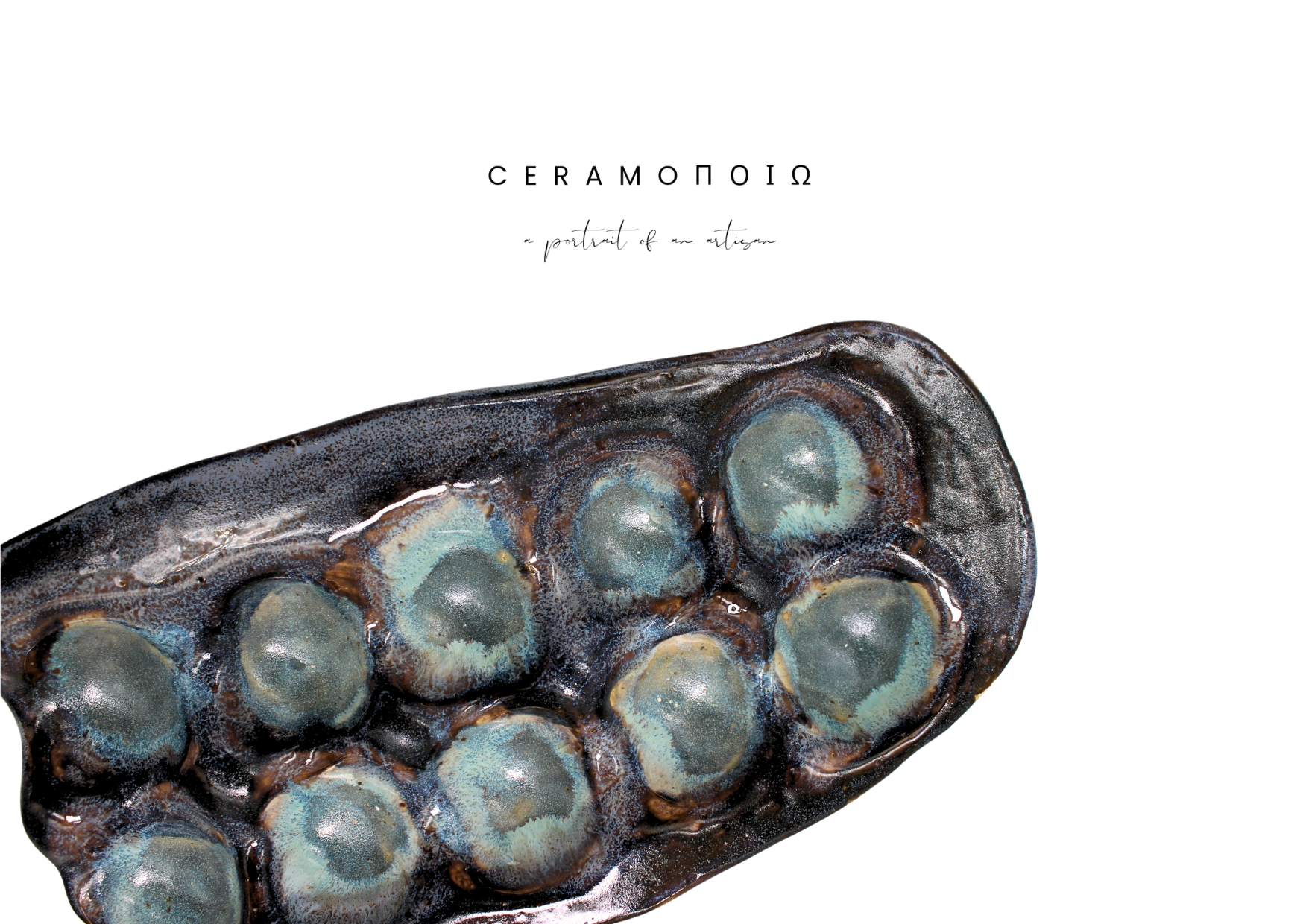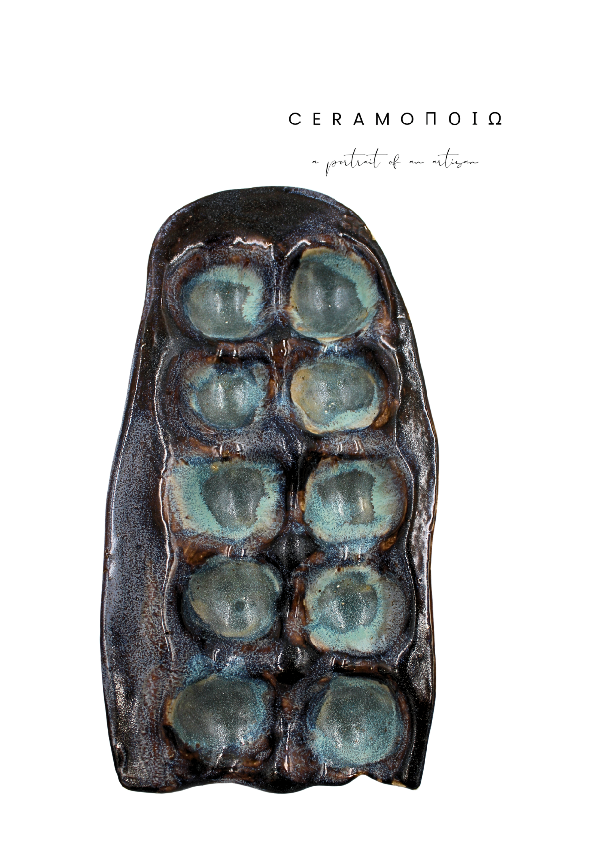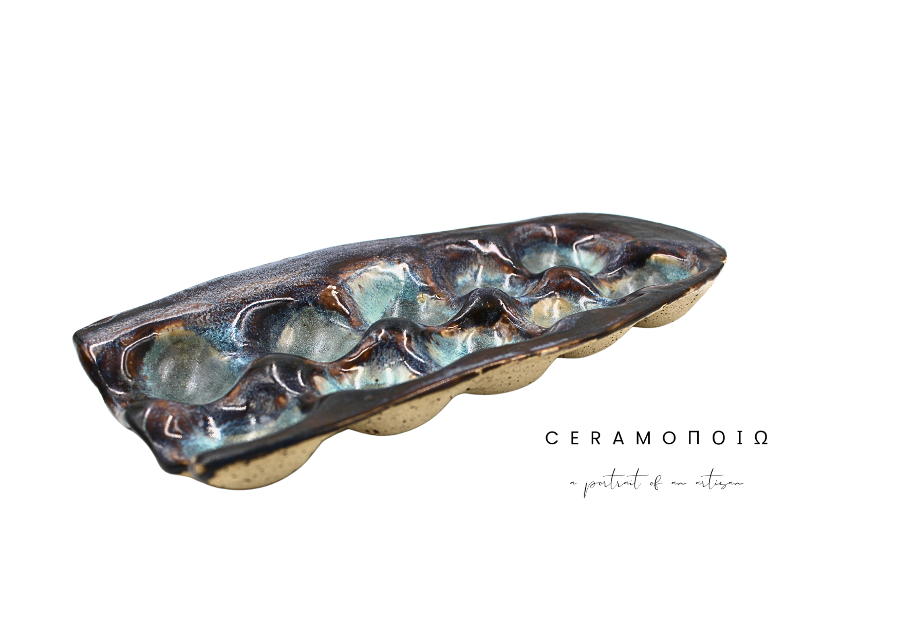 Χειροποίητη κεραμική θήκη για αυγά σε μοναδικό σχέδιο με γυαλώματα που μαγνητίζουν το μάτι.