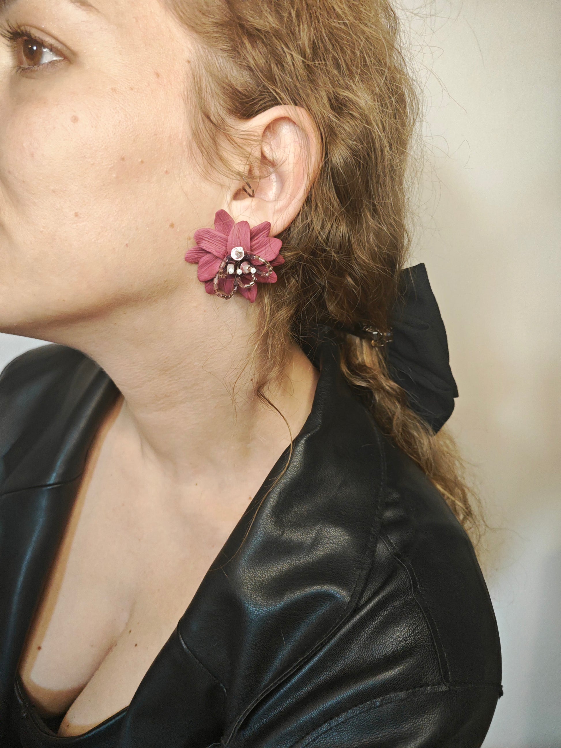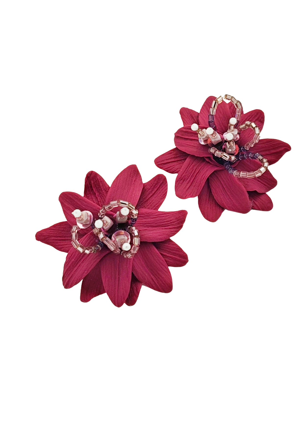 Χειροποίητα σκουλαρίκια από πολυμερικό πηλό και χάντρες σε σχέδιο λουλουδιού.